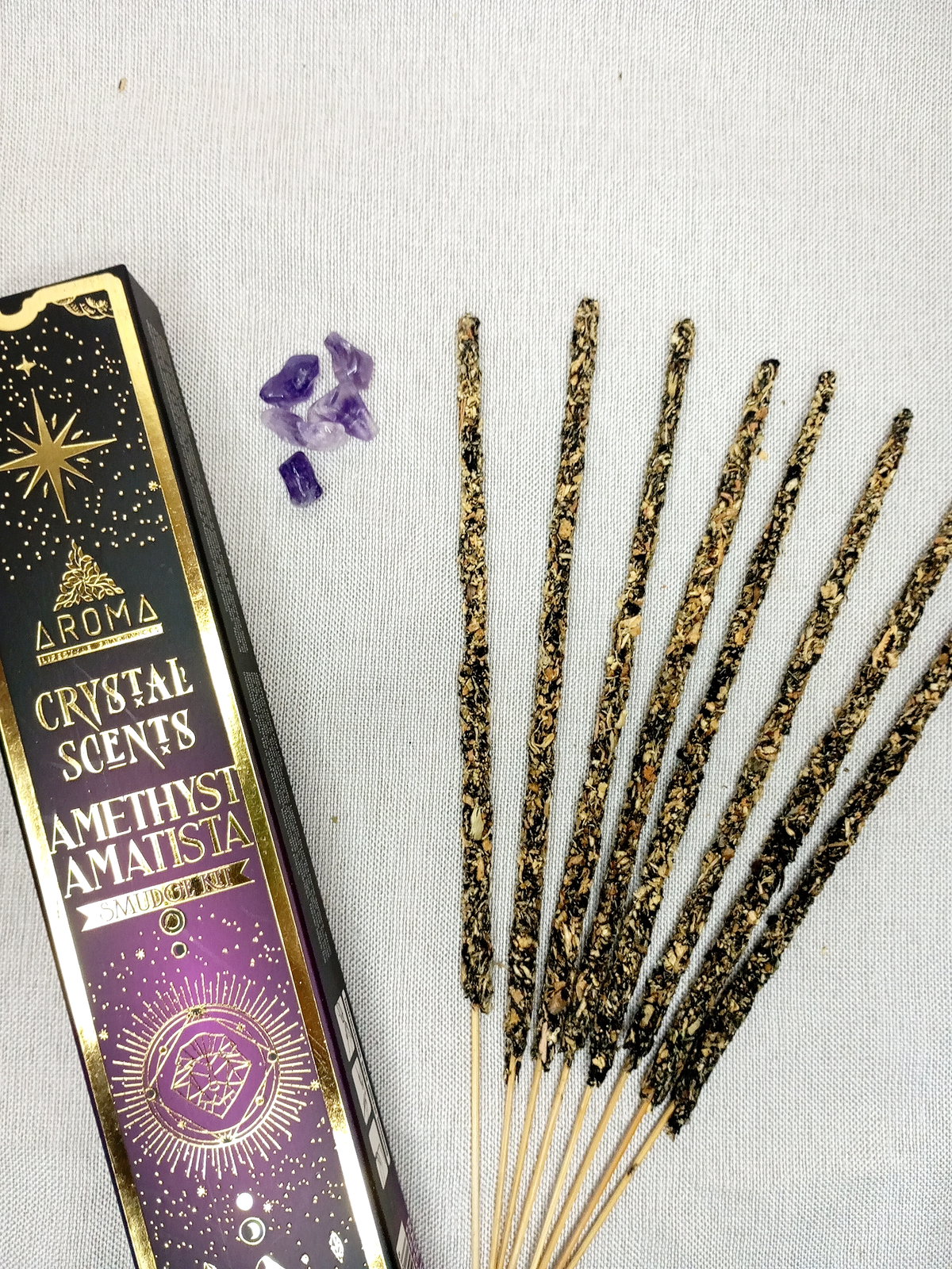 Contiene 8 sahumerios y una cajita con piedras.